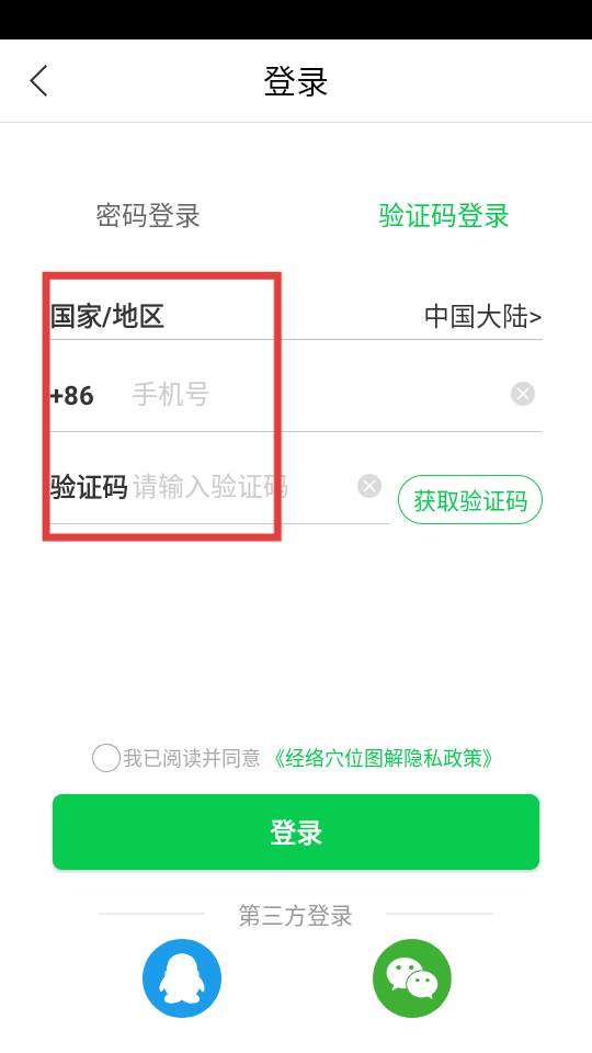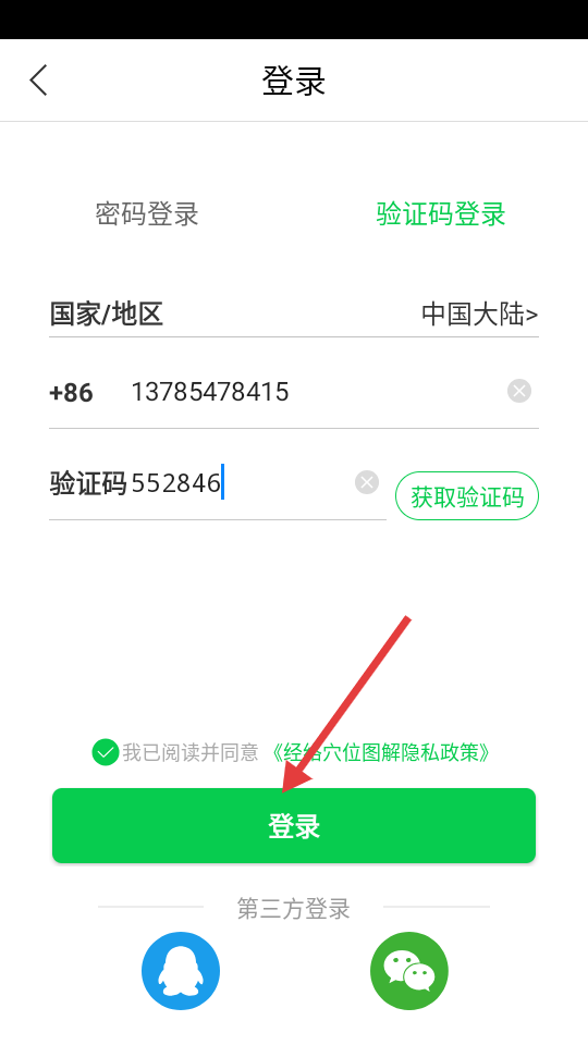 4、勾選同意《經(jīng)絡穴位圖解隱私政策》后,點擊【登錄】,完成驗證碼登錄操作。