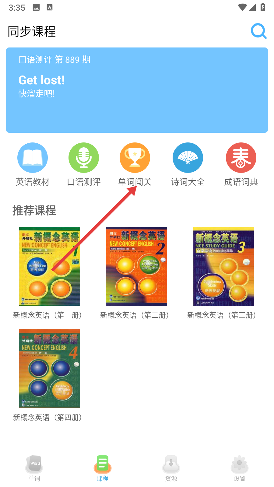 2、在同步課程頁面點(diǎn)擊【單詞闖關(guān)】,進(jìn)入單詞闖關(guān)題目頁面。