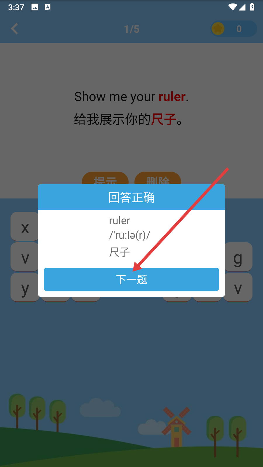 4、回答正確后點(diǎn)擊【下一題】,繼續(xù)進(jìn)行單詞闖關(guān)流程。