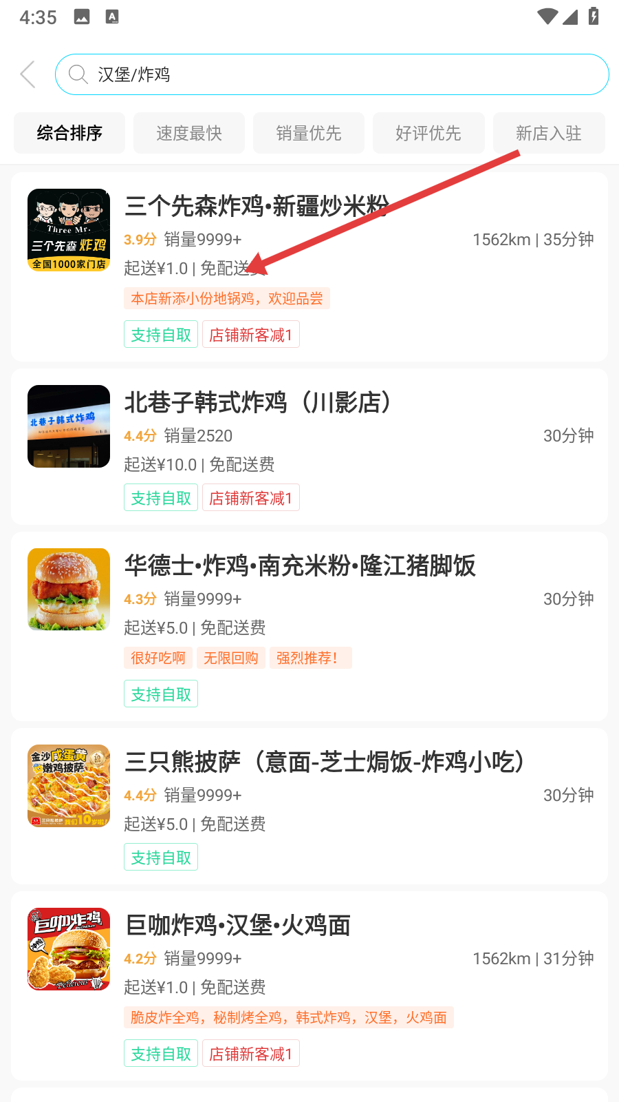 1、在APP首頁選擇食物分類,進入漢堡炸雞店鋪列表頁面。
