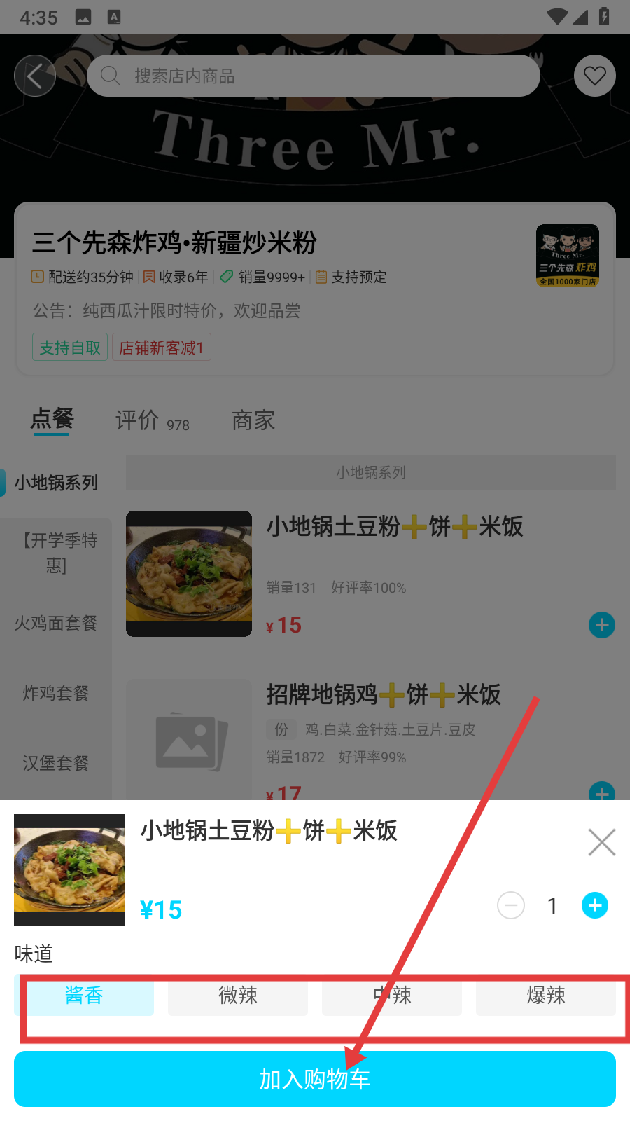 4、在菜品選項窗口選擇口味后,點擊【加入購物車】,完成該菜品的點餐流程。