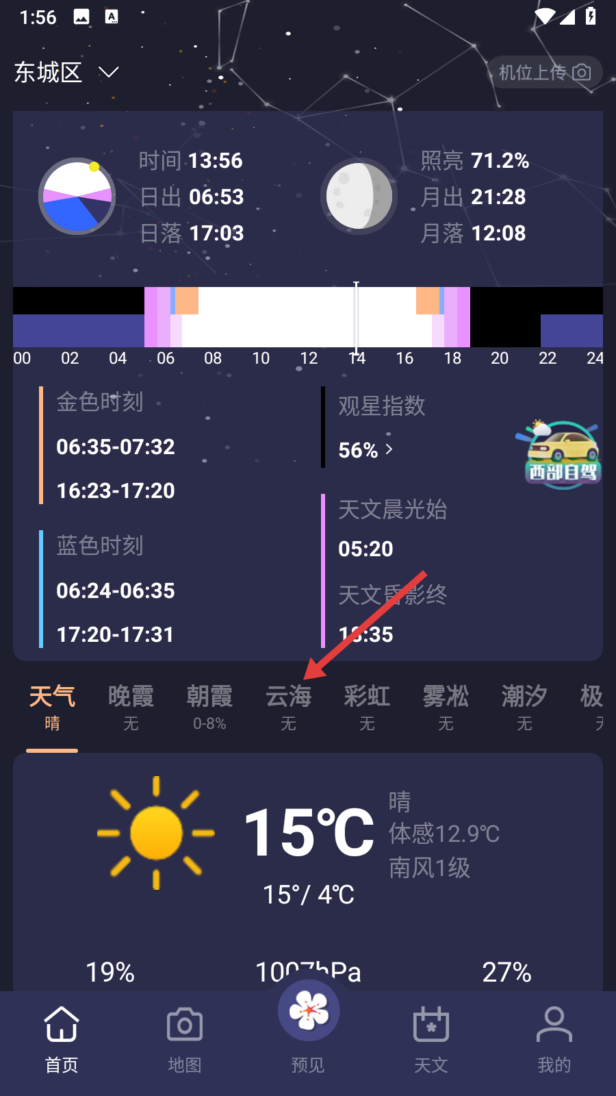 1、在莉景天氣APP首頁點(diǎn)擊【云?!繕?biāo)簽,進(jìn)入云海信息頁面,查看當(dāng)前云海相關(guān)數(shù)據(jù)。