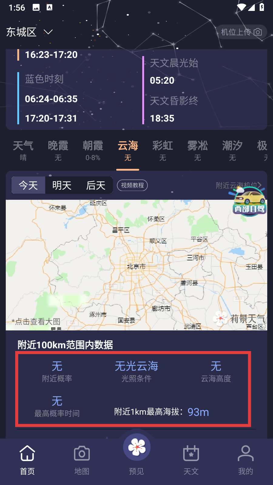2、在云海頁面查看【附近100km范圍內(nèi)數(shù)據(jù)】,了解當(dāng)前云海概率、光照條件等信息。