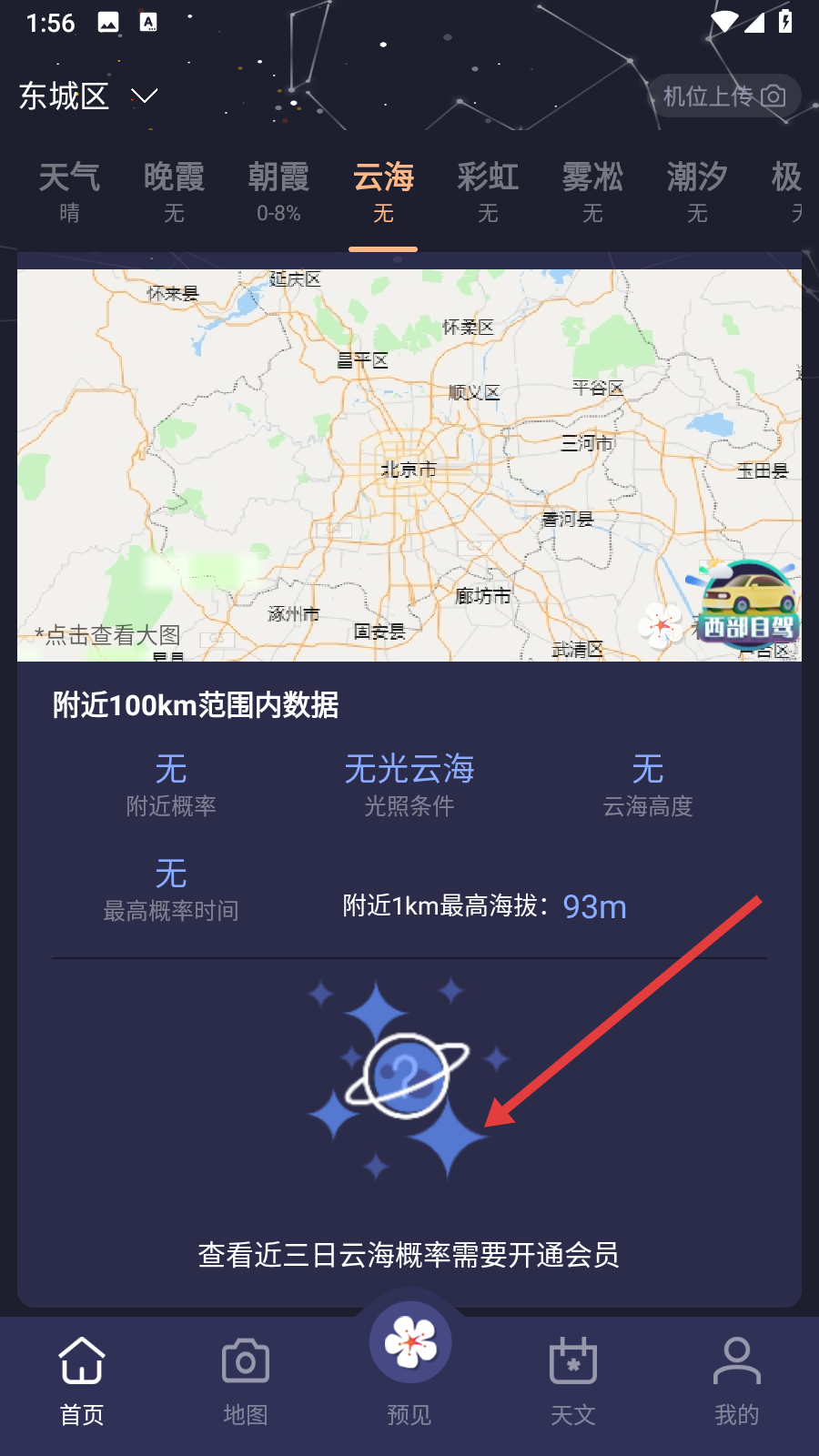 3、在云海頁面點(diǎn)擊“查看近三日云海概率需要開通會(huì)員”的提示區(qū)域,進(jìn)入會(huì)員中心頁面。