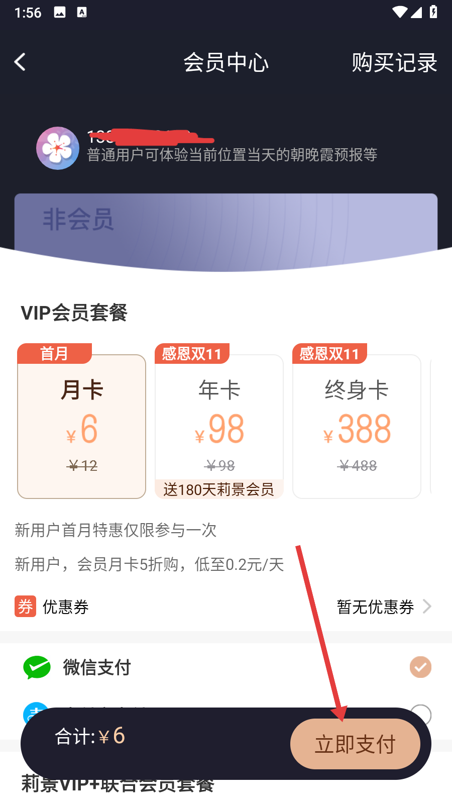 4、在會(huì)員中心選擇目標(biāo)會(huì)員套餐后,點(diǎn)擊【立即支付】,即可查看近三日云海概率。