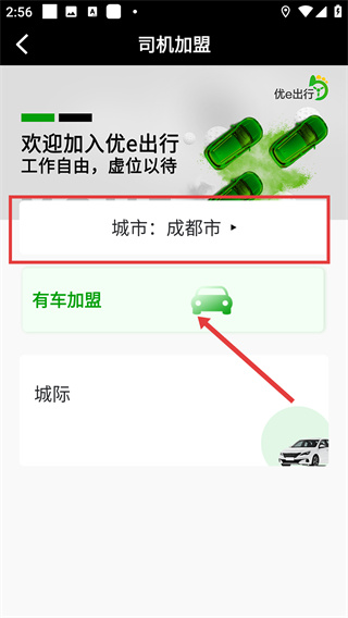 2、在司機(jī)加盟頁(yè)面,選擇所在城市,點(diǎn)擊【有車加盟】,進(jìn)入注冊(cè)材料準(zhǔn)備頁(yè)面。