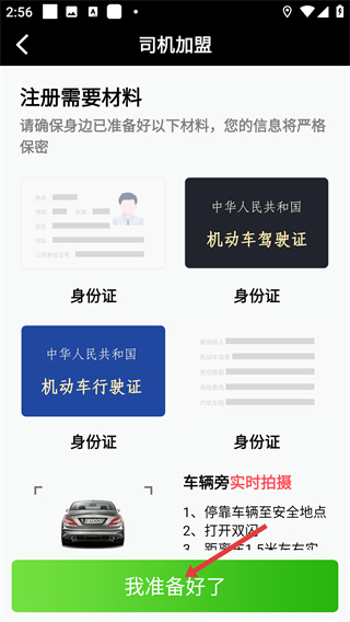 3、在注冊(cè)材料頁(yè)面,確認(rèn)準(zhǔn)備好身份證、駕駛證等材料后,點(diǎn)擊【我準(zhǔn)備好了】,進(jìn)入司機(jī)信息填寫頁(yè)面。