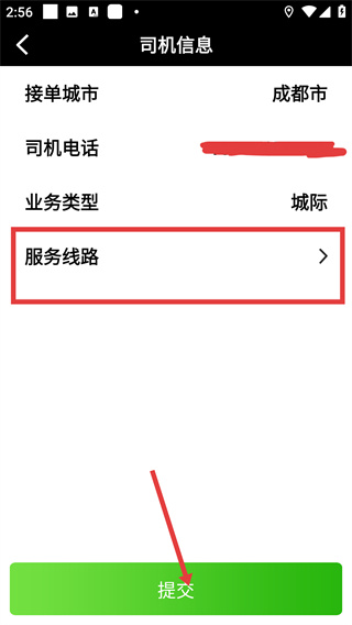4、在司機(jī)信息頁(yè)面,填寫服務(wù)線路等信息后,點(diǎn)擊【提交】,完成司機(jī)注冊(cè)申請(qǐng)。