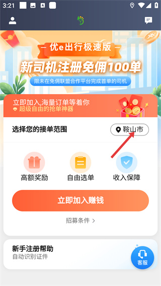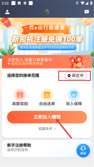 3、城市選擇完成后,點擊【立即加入賺錢】,進入提交注冊資料頁面。
