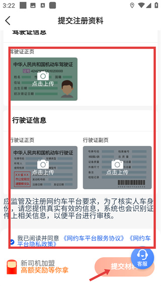 4、在提交注冊資料頁面,上傳駕駛證、行駛證等相關(guān)證件,勾選同意協(xié)議后,點擊提交材料,完成司機城市修改申請。