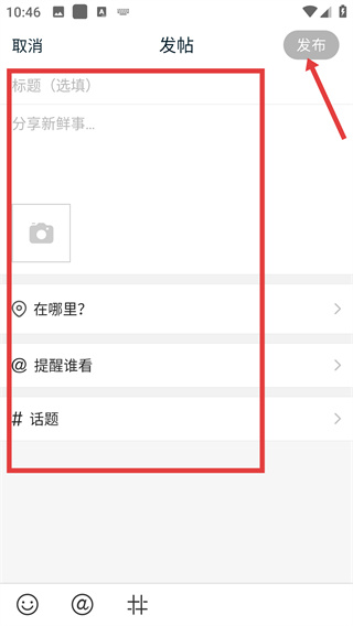 4、在發(fā)帖編輯頁面,可填寫標(biāo)題(選填)、分享內(nèi)容,還能添加圖片、位置、@好友、關(guān)聯(lián)話題等信息,確認(rèn)內(nèi)容后點(diǎn)擊“發(fā)布”按鈕,完成帖子的發(fā)布。