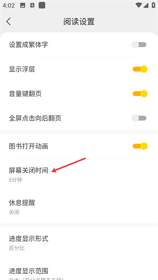 3、在閱讀設置頁面找到【屏幕關閉時間】選項,其當前默認設置為5分鐘,點擊該選項可進行時長調整操作。
