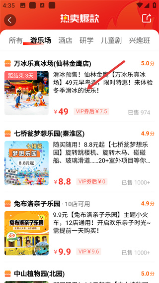 2、在游樂場頁面點(diǎn)擊“爆款”標(biāo)簽,切換至熱門游樂項(xiàng)目列表,查看當(dāng)前平臺(tái)主推的游樂場相關(guān)產(chǎn)品。