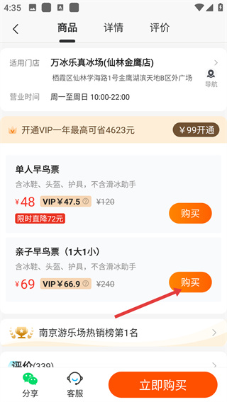 3、在熱賣爆款列表中選擇“萬冰樂真冰場(仙林金鷹店)”項(xiàng)目,進(jìn)入該項(xiàng)目的商品詳情頁面。