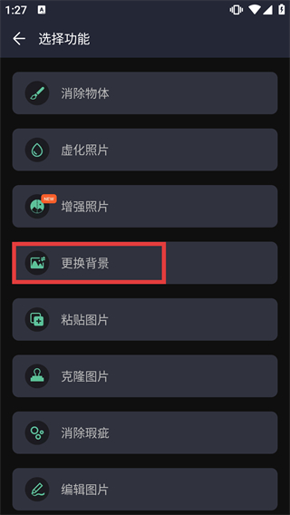 2、在功能選擇界面中點擊“更換背景”選項,進入背景更換的操作頁面。