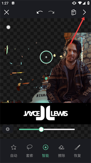 3、在更換背景頁面使用“智能”摳圖功能,完成照片主體的自動摳取。