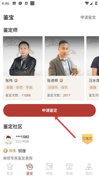 1、在首頁點(diǎn)擊底部的【鑒寶】選項,進(jìn)入鑒寶功能頁面,可查看【鑒定師】信息及【鑒定社區(qū)】內(nèi)的藏品鑒定動態(tài)。