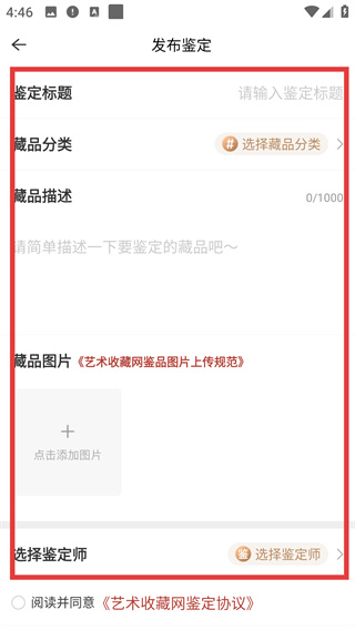 3、在發(fā)布鑒定頁面填寫【鑒定標(biāo)題】、【藏品分類】等信息,上傳【藏品圖片】并選擇對應(yīng)的【鑒定師】。
