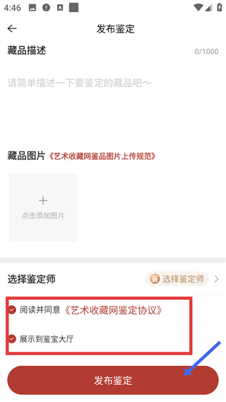 4、在發(fā)布鑒定頁面勾選【閱讀并同意《藝術(shù)收藏網(wǎng)鑒定協(xié)議》】等選項后,點(diǎn)擊【發(fā)布鑒定】提交藏品鑒定申請。