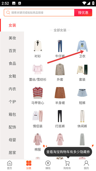 1、在分類頁面的女裝分類下,點擊【衛(wèi)衣】選項,進入衛(wèi)衣類商品的列表頁面,查看各類衛(wèi)衣相關商品。