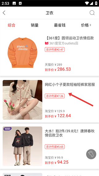 2、在衛(wèi)衣商品列表中,選擇目標商品并點擊進入其詳情頁面,可查看商品價格、返利等信息。
