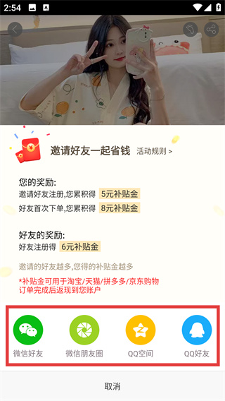 4、在邀請活動頁面,選擇對應的分享渠道,完成商品及活動的分享操作。