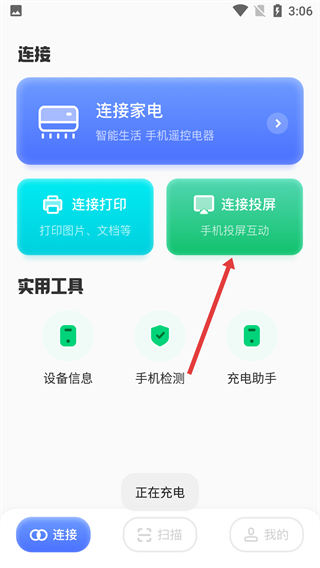 1、在應用的“連接”頁面,找到并點擊“連接投屏”選項,進入連接投屏的操作界面,準備進行投屏相關操作。