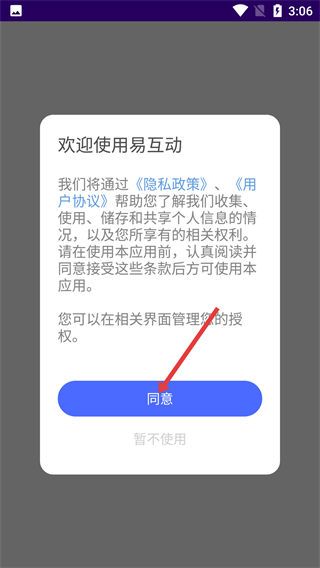1、在易互動的歡迎彈窗中,點擊“同意”按鈕,接受《隱私政策》與《用戶協(xié)議》,進入應(yīng)用的連接頁面。