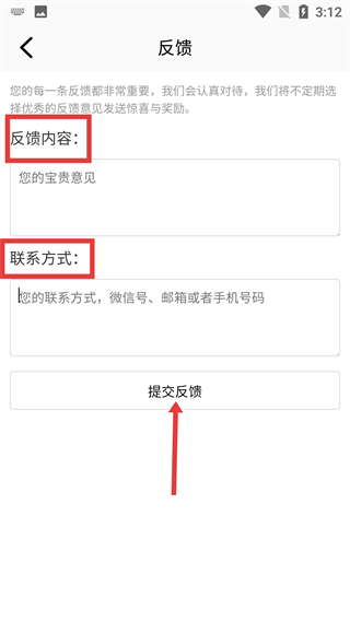 4、在反饋頁面,依次填寫“反饋內(nèi)容”與“聯(lián)系方式”,完成后點擊“提交反饋”按鈕,完成意見反饋的提交操作。