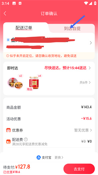 3、在訂單確認頁面找到配送方式選項,點擊【到店自提】,將訂單配送模式切換為到店自提。