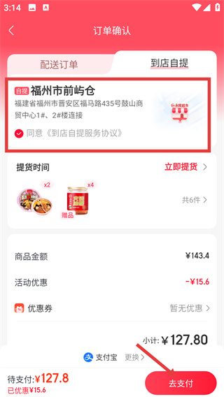 4、確認【自提地址】信息,勾選【到店自提服務協(xié)議】后,點擊【去支付】按鈕完成訂單支付操作。