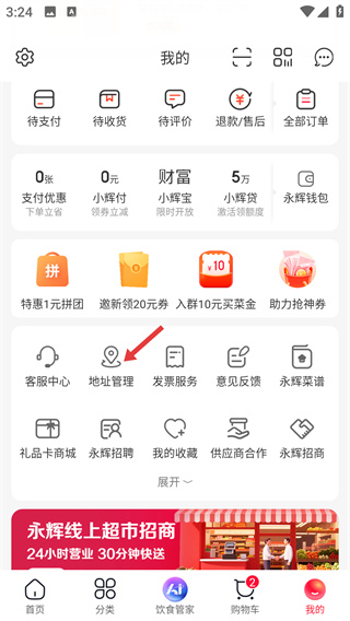 2、在個人中心頁面找到【地址管理】選項并點擊,進(jìn)入地址相關(guān)操作界面,可管理配送地址。