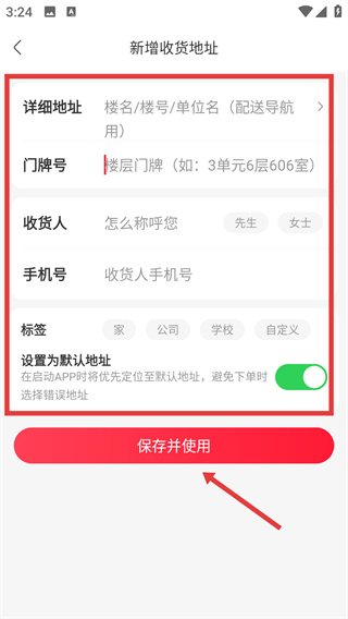 4、在新增收貨地址界面填寫【詳細(xì)地址】【手機(jī)號】等信息后,點擊【保存并使用】完成地址、電話添加。