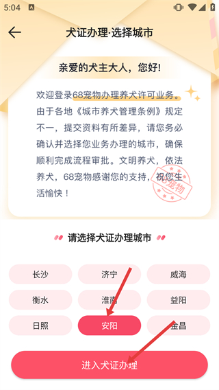 2、進入【犬證辦理-選擇城市】頁面后,選定目標城市(如【安陽】),點擊【進入犬證辦理】按鈕進入對應城市的辦理界面。