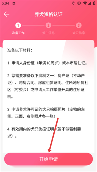 4、在【養(yǎng)犬資格認證】的準備工作頁面,確認備好所需材料后,點擊【開始申請】按鈕推進養(yǎng)犬證的申請流程。