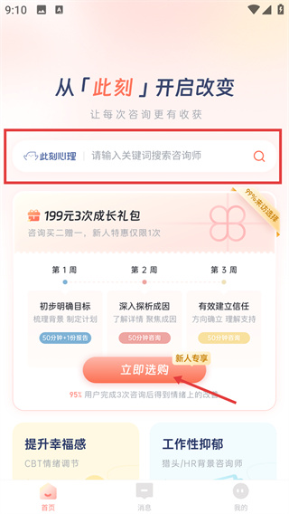 1、在【此刻心理】首頁(yè),可以搜索咨詢師,以及優(yōu)惠套餐【199元3次成長(zhǎng)禮包】,點(diǎn)擊【立即選購(gòu)】,可參與新人特惠的咨詢套餐。