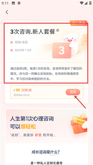 2、進(jìn)入【3次咨詢.新人套餐】頁(yè),該套餐含視頻/語(yǔ)音-50分鐘*3次,點(diǎn)擊【選擇】即可選定此新人專享套餐。