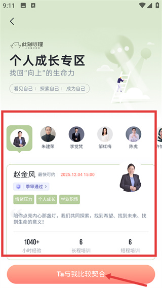 4、進(jìn)入【個(gè)人成長(zhǎng)專區(qū)】,可以挑選心儀的咨詢師,查看咨詢師信息,點(diǎn)擊【Ta與我比較契合】,可匹配該咨詢師開啟咨詢之旅。