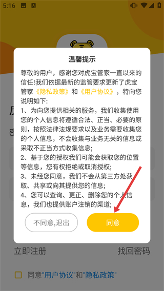 1、在【溫馨提示】彈窗中,點擊【同意】按鈕,可關(guān)閉該提示并進入【虎寶管家-基地智能管理平臺】的登錄頁面。