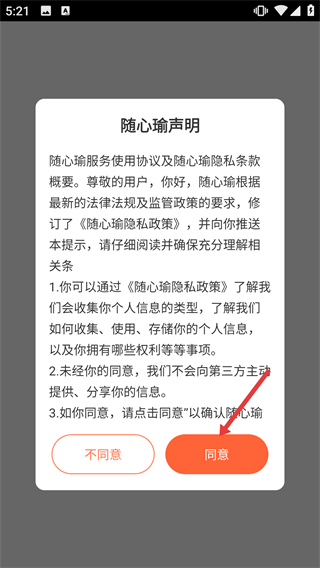 1、在【隨心瑜聲明】彈窗中,點擊【同意】按鈕,可關閉該聲明并進入【隨心瑜】的登錄選擇頁面,頁面提供不同登錄方式。