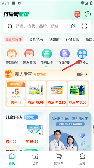 1、在【藥房網(wǎng)商城】首頁,點擊【商品分類】選項,進入藥品分類頁面。