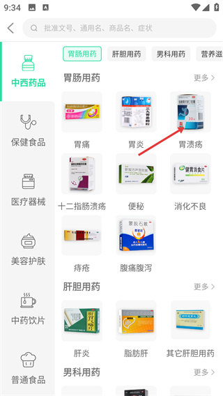 3、在【中西藥品】分類頁,切換到【胃腸用藥】標(biāo)簽,點擊【胃潰瘍】分類,進入對應(yīng)病癥的藥品列表頁面。