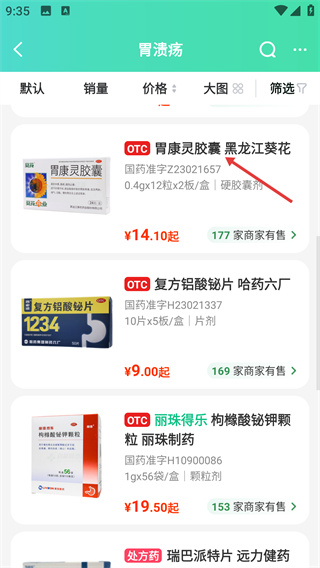 4、進入【胃潰瘍】藥品列表頁,可查看不同的藥品,顯示價格、規(guī)格及在售商家數(shù)量,選擇對應(yīng)商品進入商品詳情頁面確認付款即可完成藥品購買。