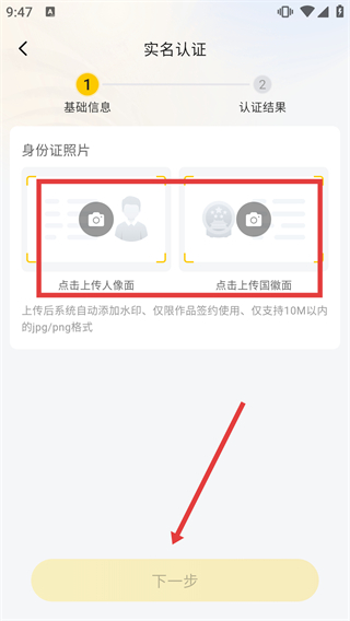 4、在【實名認證】的基礎信息頁,上傳【身份證人像面】【身份證國徽面】后,點擊【下一步】推進認證流程。