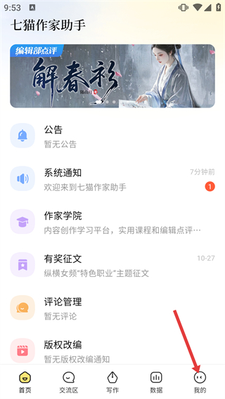 1、在【七貓作家助手】首頁底部點擊【我的】按鈕,進(jìn)入個人頁面,該頁面包含【我的隨記】【個人資料】等功能入口。