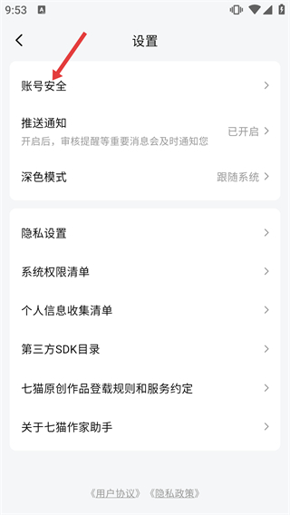 3、在【設(shè)置】頁面點擊【賬號安全】選項,進(jìn)入對應(yīng)的賬號安全管理頁面,可處理賬號相關(guān)安全設(shè)置。