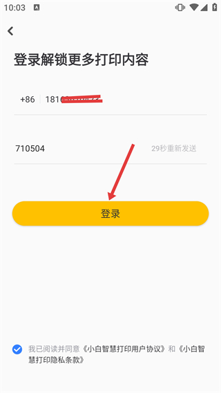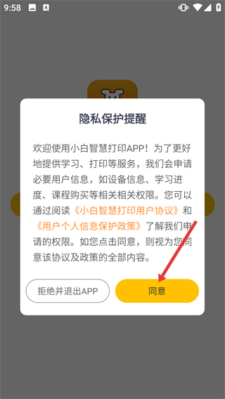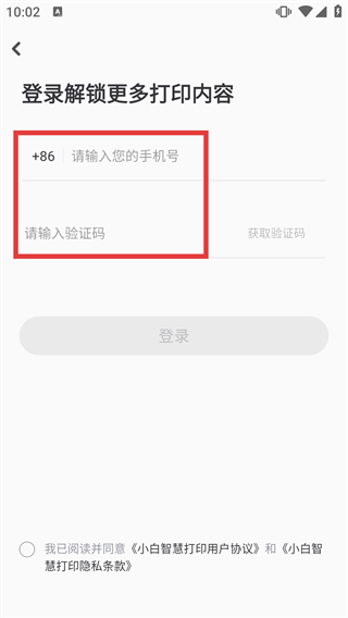 1、在隱私保護(hù)提醒彈窗中,點擊【同意】按鈕,可進(jìn)入【小白智慧打印】的登錄選擇頁面。