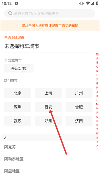 1、在購車城市選擇頁,可點【開啟定位】自動選城市,也能直接選熱門城市(如西安),選定后進入對應(yīng)城市購車頁面。