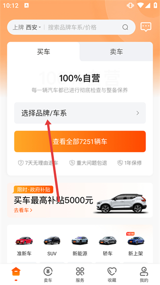 2、選好購車城市后,在購車頁點擊【選擇品牌/車系】選項,進入品牌選擇界面,以便進一步篩選車型。
