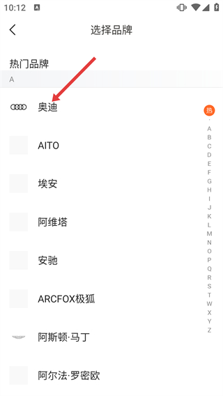 3、進入選擇品牌頁面后,在熱門品牌列表中找到并點擊【奧迪】,即可進入該品牌對應(yīng)的車系列表頁面。